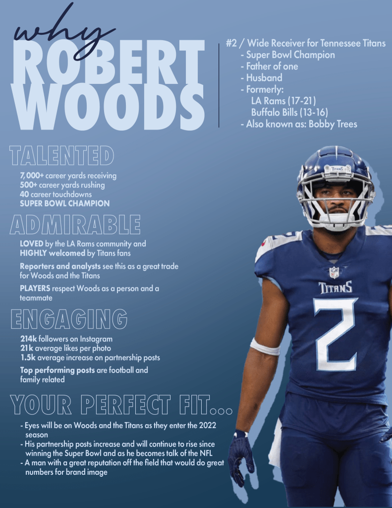 Create a marketing profile for our current client Robert Woods. This should be a one-page document explaining who Robert is and outlining his overall marketability both regionally and nationally. Think of this as a pitch deck which we would provide to a brand when pitching him for an endorsement deal. What makes him a good choice to represent a brand? What unique attributes does he have that a brand might be able to connect with? What can he offer that another athlete might not be able to?